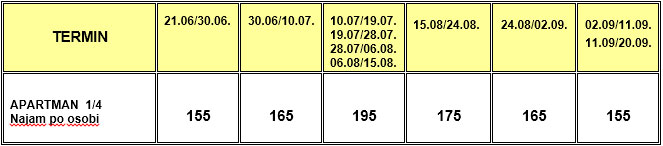 Ulazak u apartmane od 14.00h, a napuštanje do 09.00 poslednjeg dana boravka.