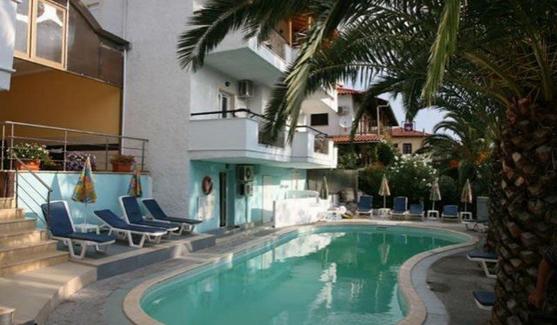 Hotel-Apartmanskog tipa „GOLDEN SUN“ je po svojoj lokaciji, privatnosti, blizini mora (90 metara) kao I centra (150 metara), jedna od najtraženijih vila u Pefkohoriju. U sklopu hotela-apartmana nalazi se recepcija, BAZEN, pool bar, I izuzetno lepi I moderni studiji i apartmani. U ponudi su dvokrevetni studiji, trokrevetni studiji, četvorokrevetni studiji, kao I trokrevetni apartmani i četvorokrevetni apartmani, koji se nalaze na prvom i drugom spratu ove prelepe vile. U sklopu vile postoji manji parking, ali je našim gostima u slučaju prebukiranosti obezbeđen parking u blizini hotela. Izuzetna za porodice sa decom, kao i za parove i individualne turiste i društva.