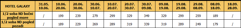 Cene su izražene po osobi na bazi noćenja sa doručkom na 10 noćenja i sastoje se iz deviznog i dinarskog dela