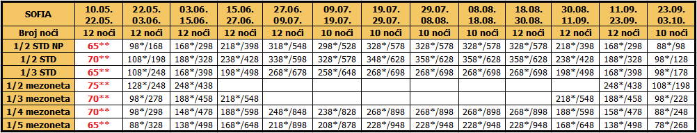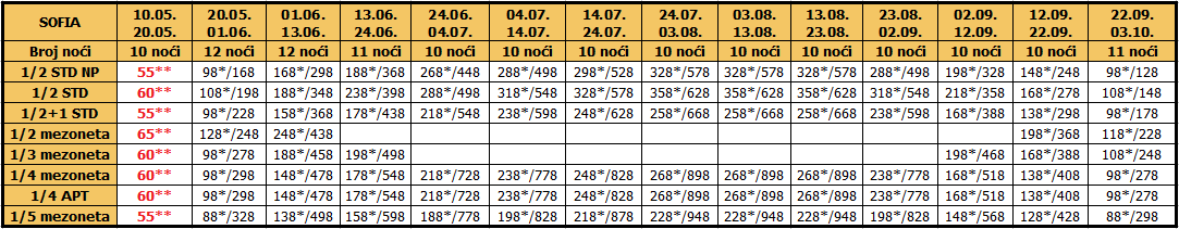 – Cena sa zvezdicom * predstavlja cenu paket aranžmana (autobuski prevoz + smeštaj) i izražena je po osobi.