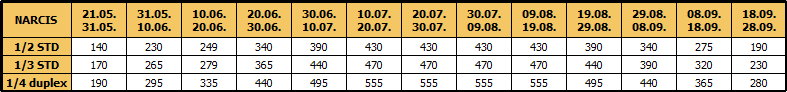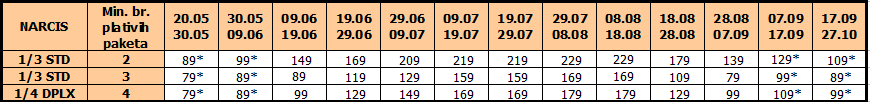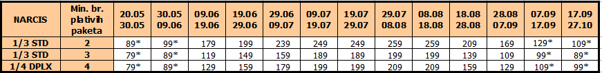 -sopstveni prevoz u slučaju sopstvenog prevoza cena se umanjuje za 30€ po osobi ( osim u smenama sa * u kojima nema umanjenja)