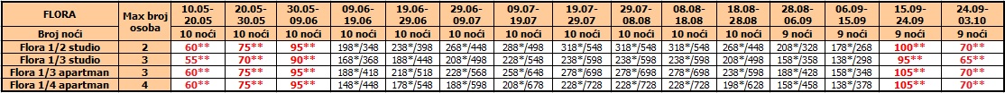 Cene su za najam studija/apartmana za navedeni broj noći i maksimalan broj osoba bez obzira na uzrast. Pored navedenog broja osoba bez posebne doplate i bez sopstvenog ležaja može boraviti dete do 6 godina. Dete starije od 6 godina, a mladje od 12 godina može boraviti pored maksimalnog broja osoba u apartmanu bez sopstvenog kreveta uz doplatu od 5eur/danu. Postoje kuće u kojima boravak više od maksimalnog broja osoba nije moguć ni uz doplatu. Pored takvih kuća, ovo nije moguće ni u 1/2+1, 1/2+2,1/3+1 ,1/4, 1/5 studijima, 1/4+1 apartmanima, 1/5+1 duplexima.
