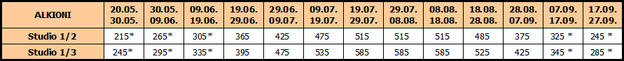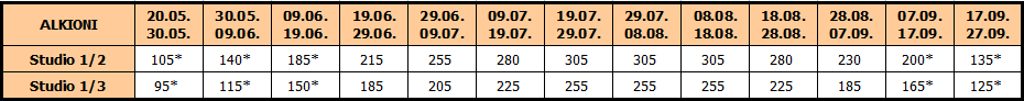 VILA ALKIONI se nalazi uz obalu mora, u mirnom kraju, u neposrednoj blizini plaže (tri minuta hoda). Raspolaže dvokrevetnim i trokrevetnim studijima sa kuhinjom-nišom (kompletno opremljena sa posuđem, dve ringle, frižider), kupatilom (tuš kada,WC, lavabo saogledalom), terasamaduboka lođa )  koje gledaju na more, TV i AC. Vila poseduje WI-FI internet. Upotreba klime nije uključena u cenu i plaća se na licu mesta 3 EUR dnevno. Promena posteljine na svakih pet dana.
